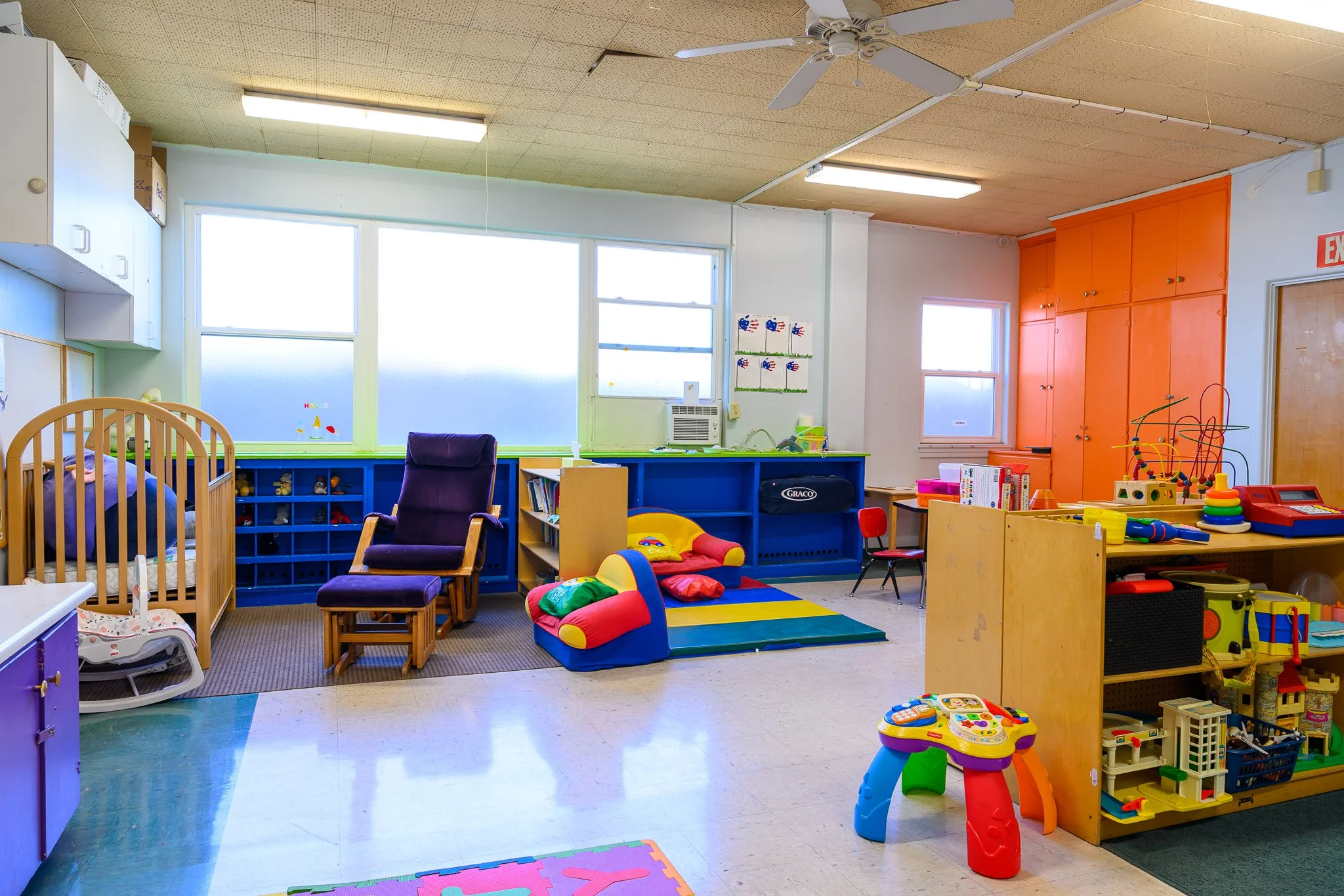 A colorful early childhood classroom with toys, a crib, a purple armchair, and storage cabinets.